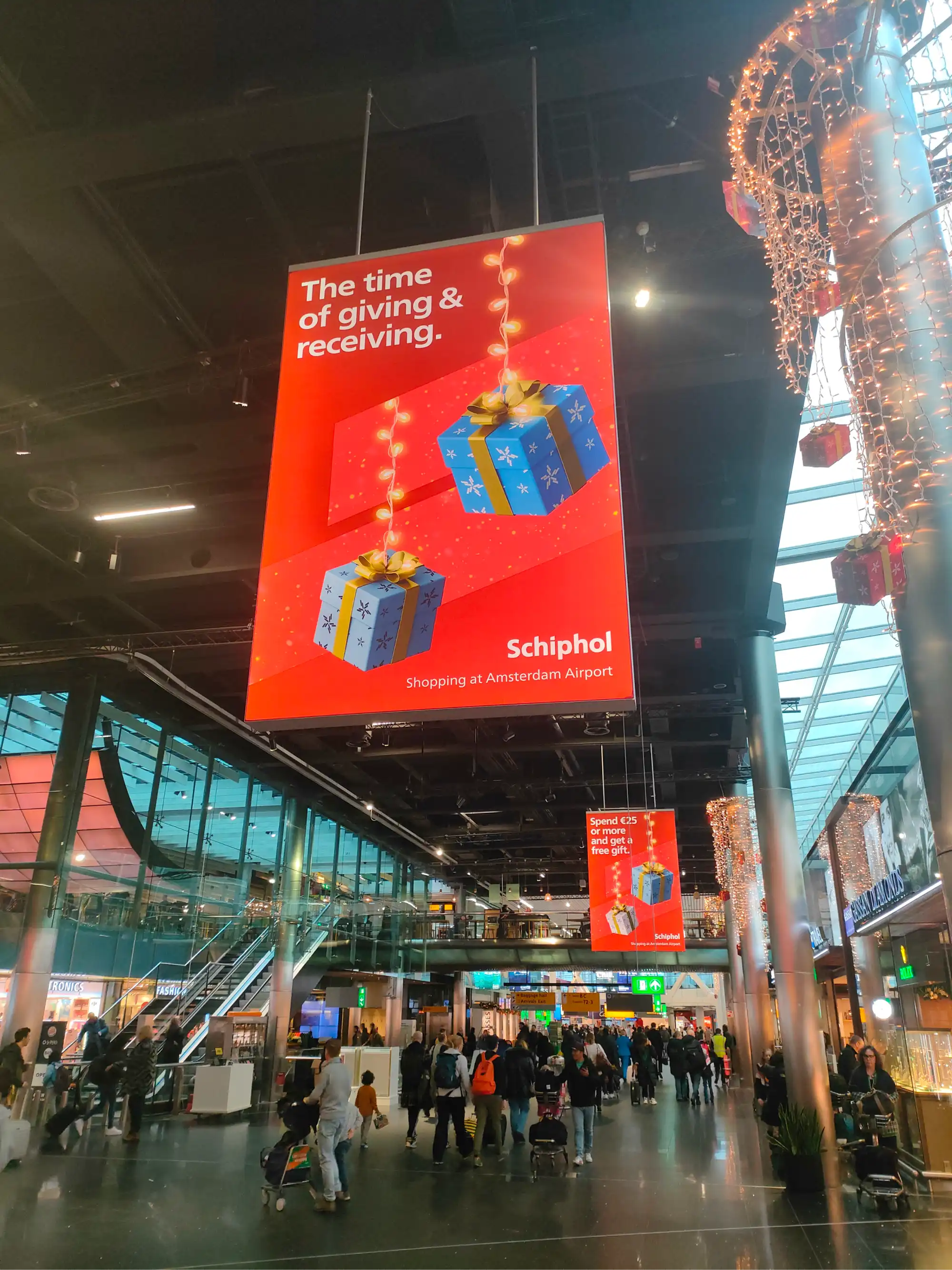 Anyone visiting Schiphol Airport during the Christmas season since 2021 will be greeted by thousands of gift boxes decorated throughout the terminal. Although simple in design, these gifts were created by me, each featuring a star-shaped pattern derived from the Schiphol logo. As someone who travels abroad during the holidays to visit family, it’s a delight to see my work displayed in full for everyone to enjoy.